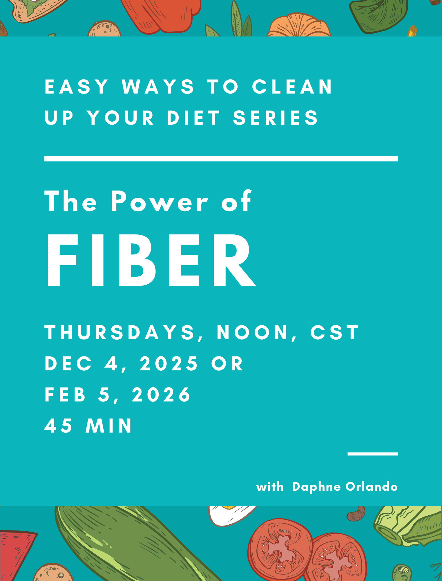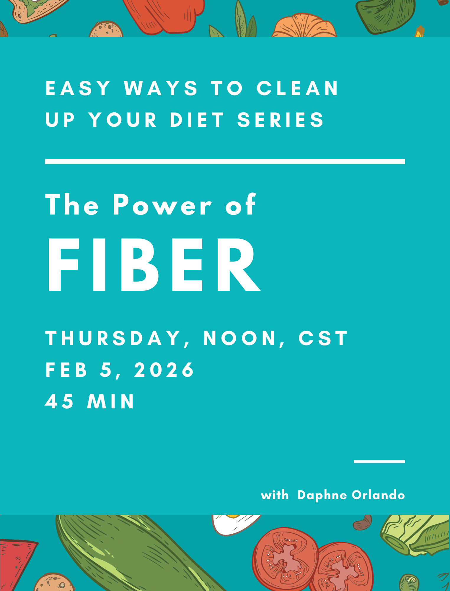 This is a live, 45-minute lunchtime Zoom session — feel free to bring your lunch and relax while you listen, learn, and ask questions. We’ll spend the first 30 minutes exploring fiber; what is soluble vs insoluble, why it matters and how to get more of it on your plate. The last 15 minutes will be open for Q&A.